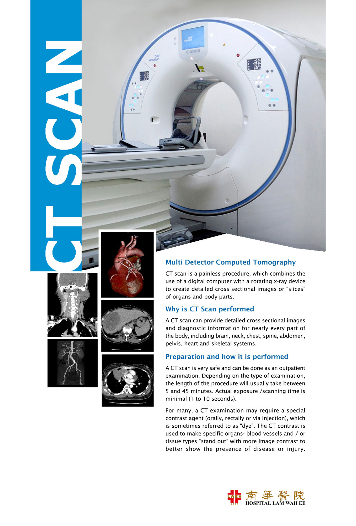 A CT scan can provide detailed cross sectional images and diagnostic information for nearly every part of the body, including brain, neck, chest, spine, abdomen, pelvis, heart and skeletal systems.