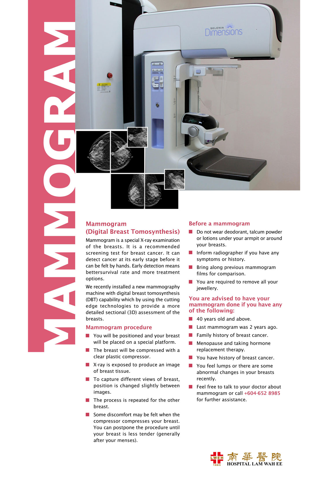 We recently installed a new mammography machine with digital breast tomosynthesis (DBT) capability which by using the advanced technologies to provide a more detailed sectional (3D) assessment of the breasts.