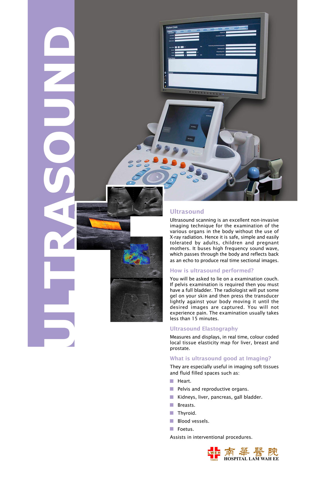 Ultrasound scanning is an excellent non-invasive imaging technique for the examination of the various organs in the body without the use of x-ray radiation. Hence it is safe, simple and easily tolerated by adults, children and pregnant mothers. It buses high frequency sound wave, which passes through the body and reflects back as an echo to produce real time sectional images.